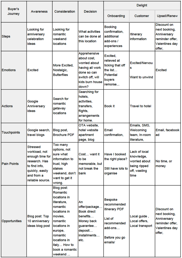 Our ideal customer doesn’t jump out of bed one morning declaring ‘I must book a double room at X hotel!’ If we can understand what the decisions they need to make, then we can produce great content. If we can understand what objections they may have, the we can produce greater content.
